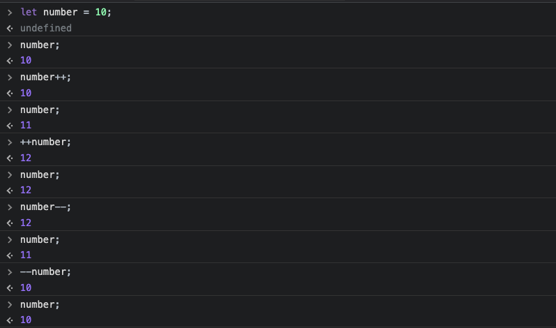 : ++, –로 셀 수 있습니다. 단, ++, –가 붙는 위치에 따라 값이 달라지므로 주의해야 합니다.