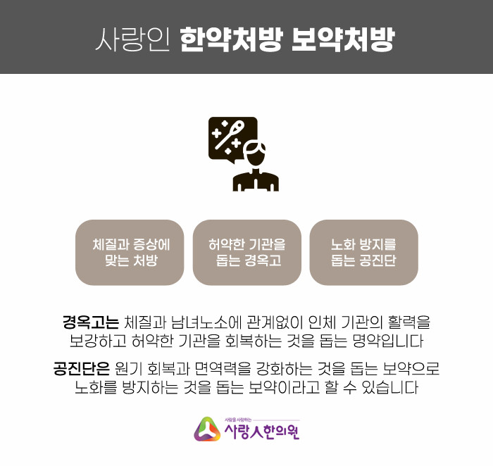 사람의 삶의 질에 영향을 미치는 각종 이상 증상으로 고통받고 계시다면 이곳에서 계속해서 평택담즙질환상담과 한약처방상담을 진행하시길 바라겠습니다. 알려드리기 위해 여기에서 공진단, 경옥고 등의 한약재 조리법을 논할 수 있습니다. 면역력 강화, 원기회복, 노화방지에 도움을 주는 공진단은 남녀노소, 체격에 관계없이 모두에게 도움이 되는 보약으로, 자덕고와 같이 활력을 높여주는 보약처방도 상담이 가능합니다.