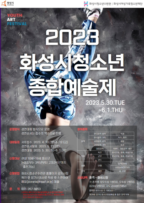 화성시청소년예술제 참가신청서 및 자세한 사항은 화성시청소년수련원 홈페이지 공지사항에서 확인할 수 있다., 문의사항은 화성시청소년수련원으로 연락주세요(031-267-8853)당신은 저희에게 연락하실 수 있습니다.